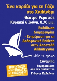 Την Κυριακή 6 Ιουνίου 2010 και στις 20.30, η Δημοτική Παράταξη “Αντίσταση με τους Πολίτες του Χαλανδρίου”, πραγματοποιεί εκδήλωση διαμαρτυρίας, στην Ρεματιά Χαλανδρίου, για την δολοφονική επίθεση των Ισραηλινών στην ανθρωπιστική αποστολή της Γάζας.